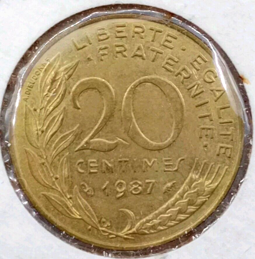 This is a 1987 France 20 Centimes coin that has been circulated. It has not been graded or certified. The coin was manufactured in France and is part of the Coins & Paper Money category, specifically the Coins: World subcategory.