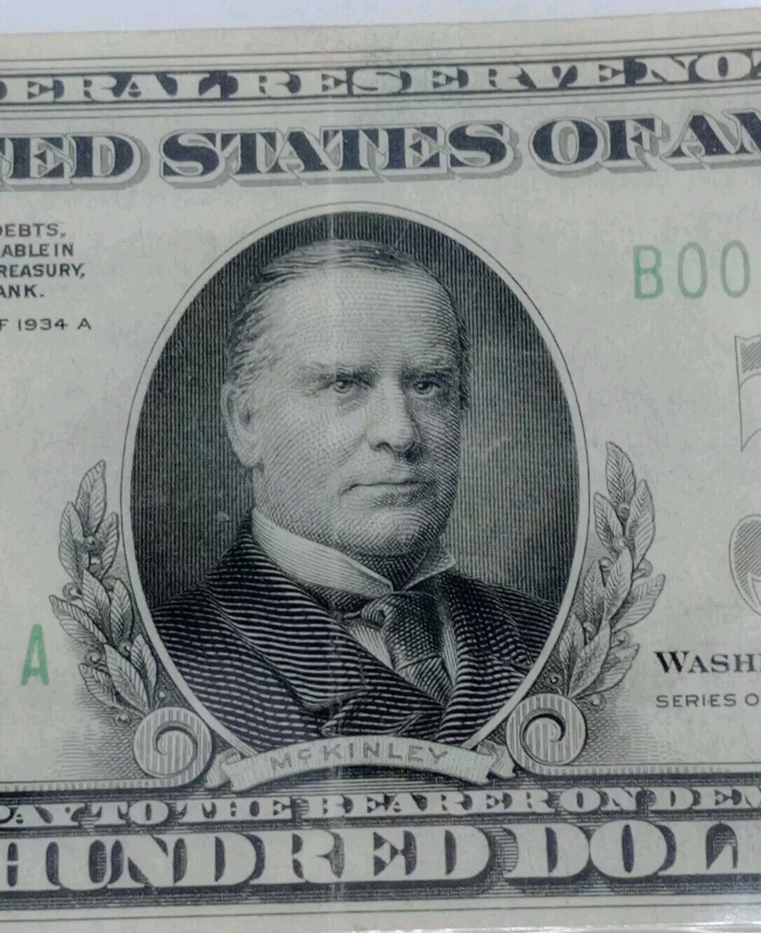 This almost AU $500 Dollar Note featuring President McKinley is a rare find for any collector of Federal Reserve Notes. The note is circulated and ungraded, adding to its unique character and history. The denomination of the note is $500, and it was printed in 1934 during the series 1934 A. This banknote is a great addition to any collection of US small size notes, and its preservation is a testament to its quality.
